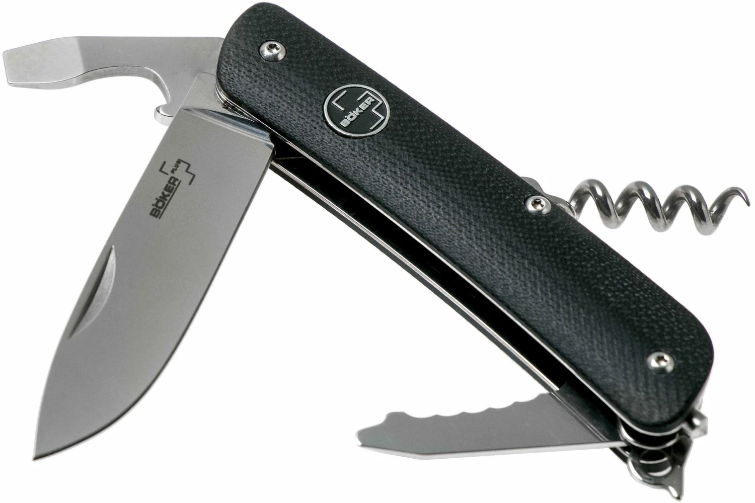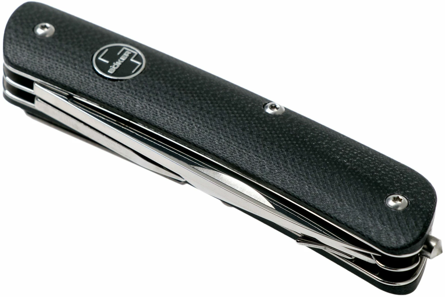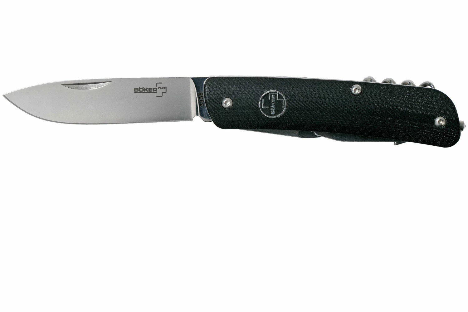 Les couteaux de poche de la gamme Böker Tech Plus Tool ressemblent aux fameux couteaux suisses rouges. Mais au lieu d’être fabriqués avec des plaquettes en plastique rouge traditionnel, ces nouveaux couteaux ont un manche en G10. La lame est en acier Sandvick 12C27, un type d’acier résistant à la corrosion spécialement conçu pour la coutellerie. L’émouture creuse de la lame est superbe. Elle est donc très fine derrière le fil pour des performances de coupe encore meilleures. Ce couteau ne dispose pas de mécanisme de verrouillage à part entière mais d’un slipjoint. Le clip de poche placé sur le côté droit peut être déplacé de sorte à convenir pour les gauchers comme pour les droitiers. Un brise vitre est placé à l’extrémité du manche.