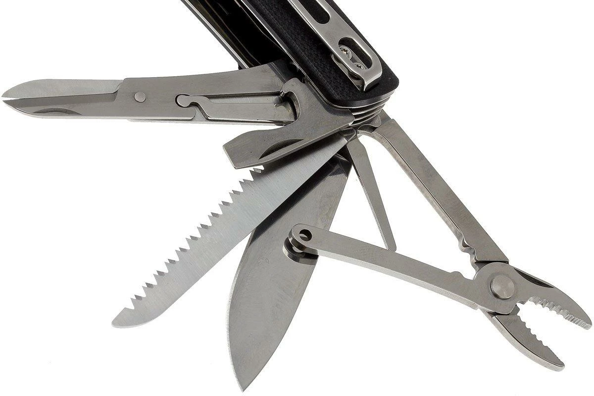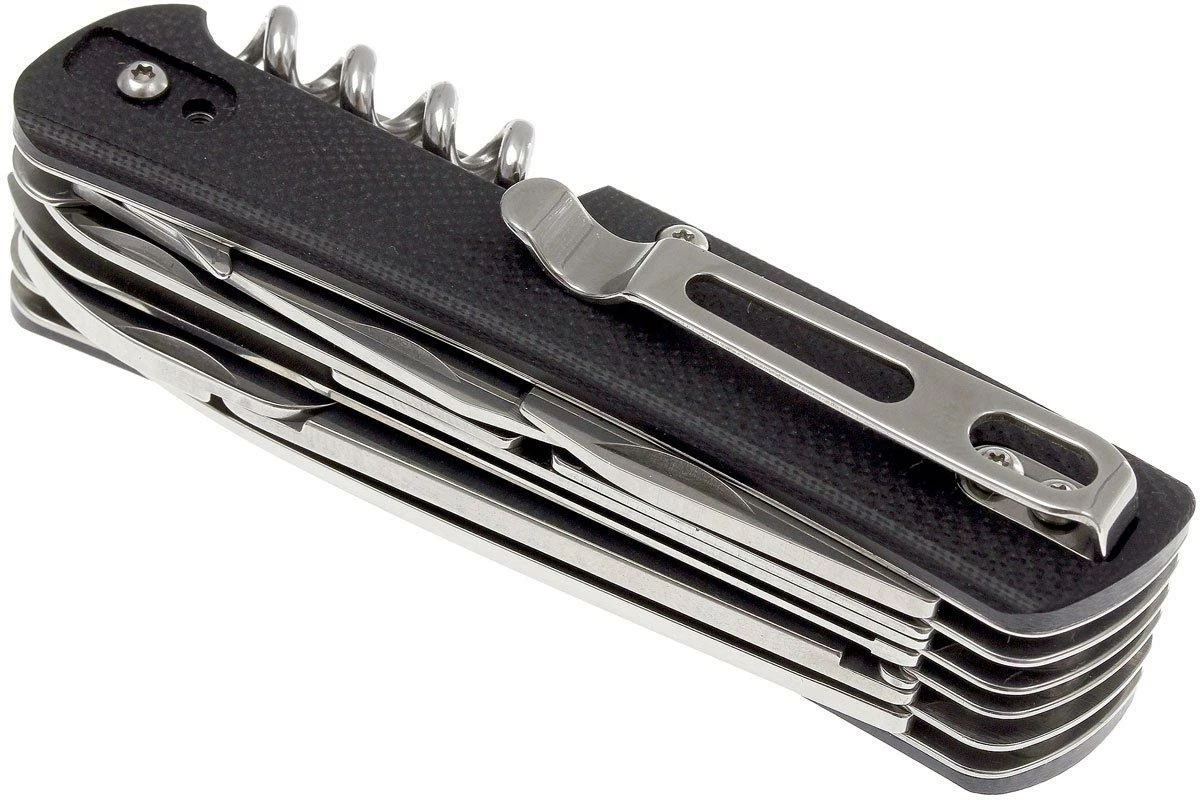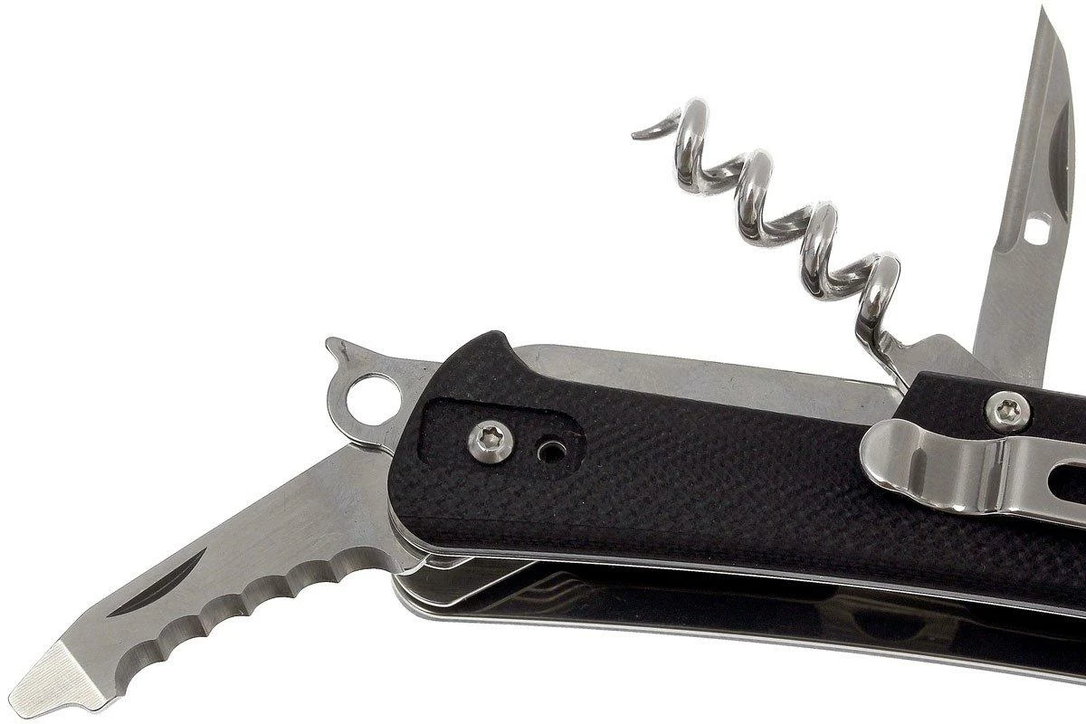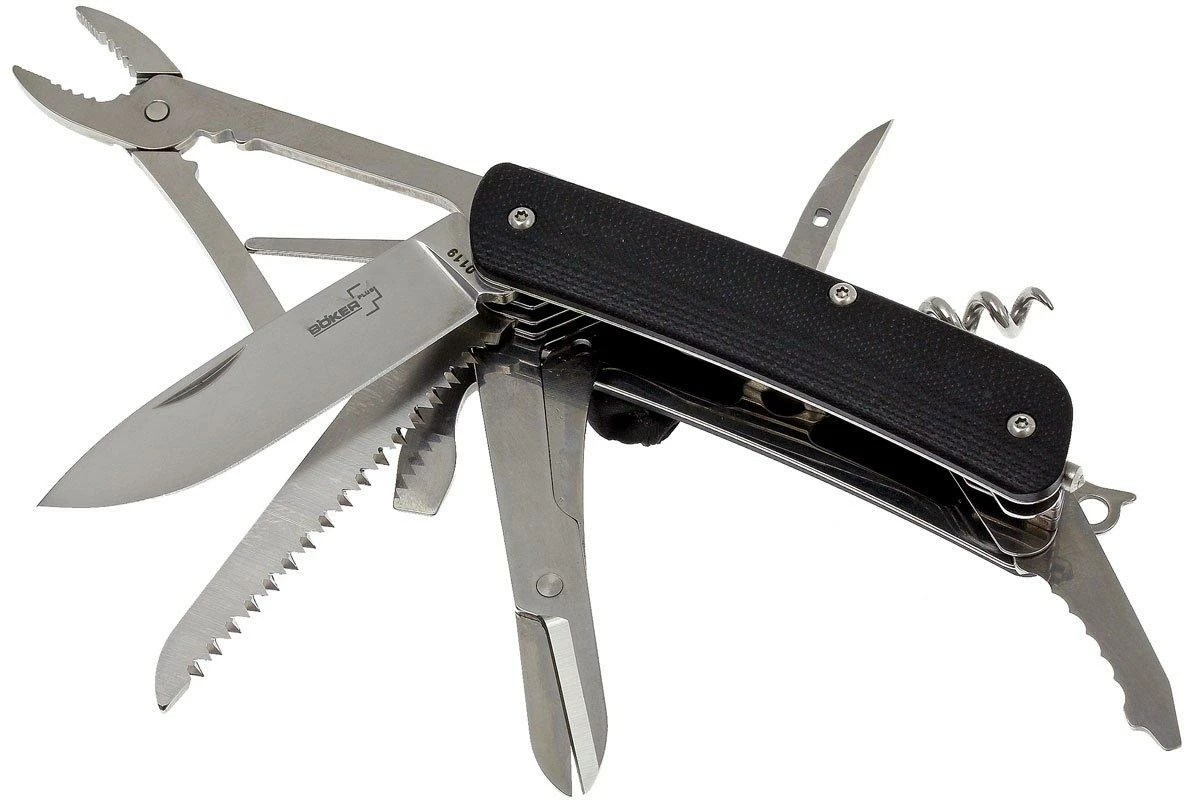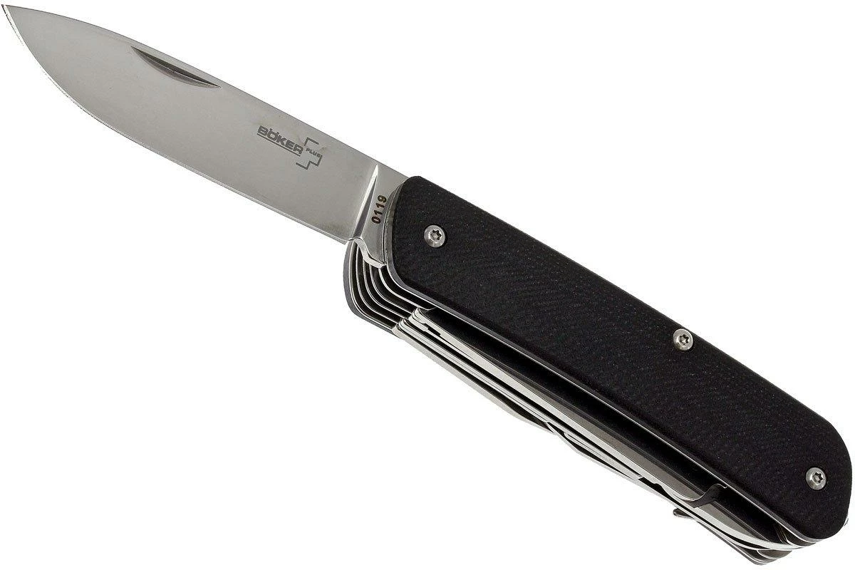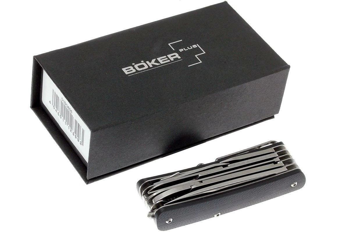 Les couteaux de poche de la gamme Böker Tech Plus Tool ressemblent aux fameux couteaux suisses rouges. Mais au lieu d’être fabriqués avec des plaquettes en plastique rouge traditionnel, ces nouveaux couteaux ont un manche en G10. La lame est en acier Sandvick 12C27, un type d’acier résistant à la corrosion spécialement conçu pour la coutellerie. L’émouture creuse de la lame est superbe. Elle est donc très fine derrière le fil pour des performances de coupe encore meilleures. Ce couteau ne dispose pas de mécanisme de verrouillage à part entière mais d’un slipjoint. Le clip de poche placé sur le côté droit peut être déplacé de sorte à convenir pour les gauchers comme pour les droitiers. Un brise vitre est placé à l’extrémité du manche.