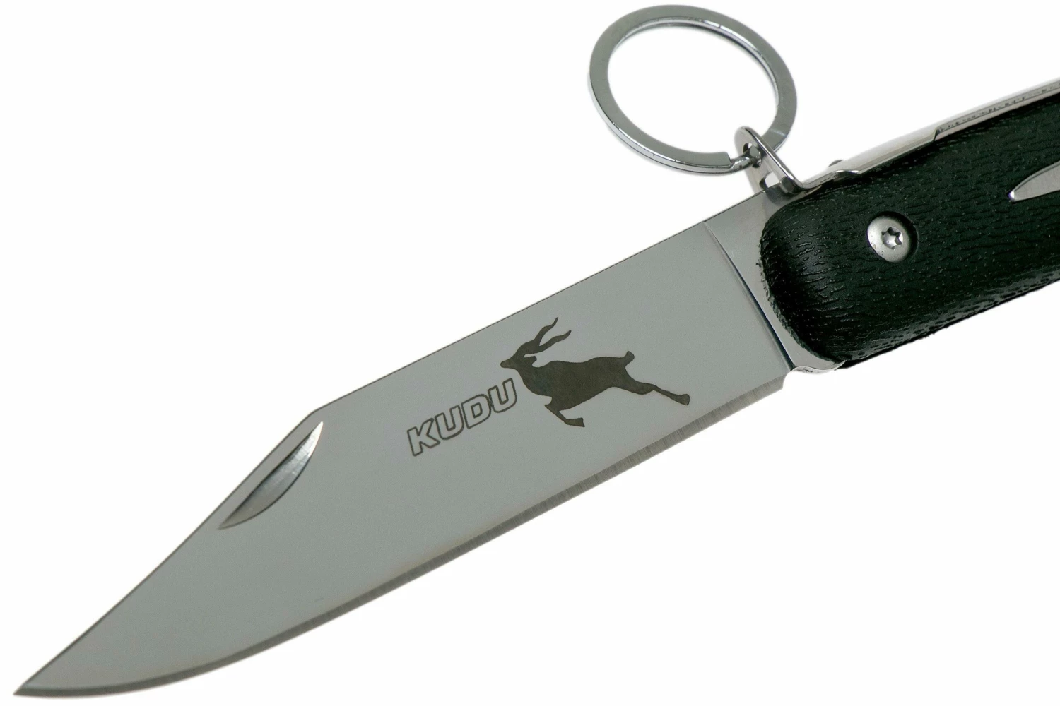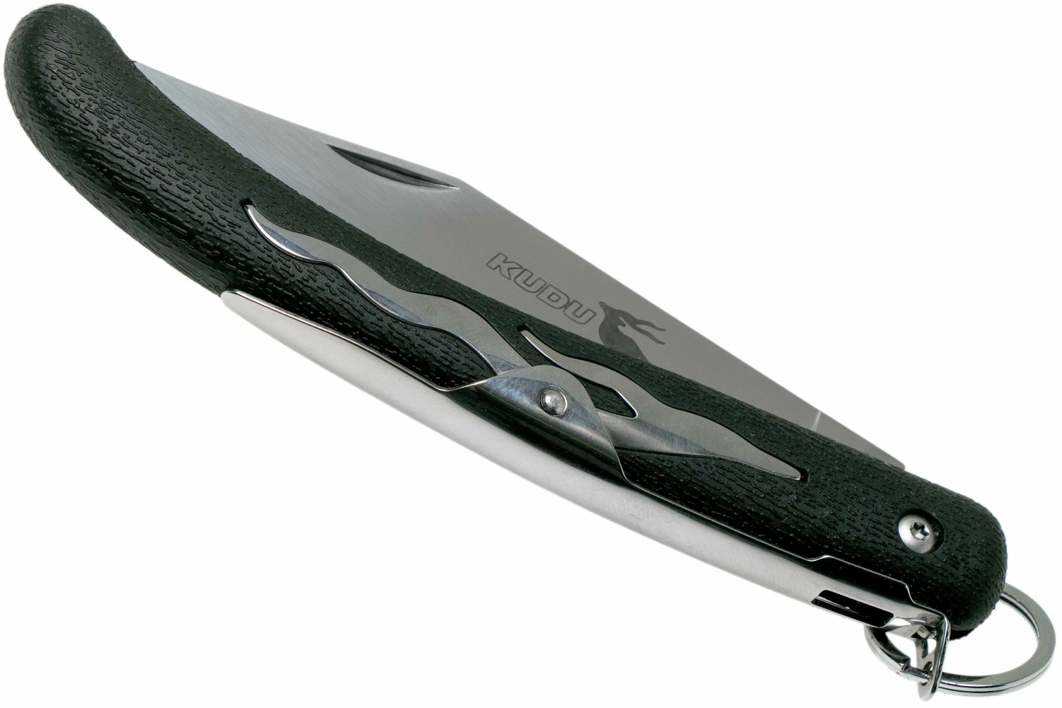 Le Cold Steel Kudu 20KK est un couteau de poche particulière aux origines Sud-Africaines. L’énorme anneau au-dessus du manche est vraiment spécial. Il appartient à ce que l’on appelle la ‘ring lock’. C’est en tirant sur l’anneau que l’on déverrouille la lame lorsqu’elle est en position ouverte. Un mouvement qui demande un peu de pratique mais qui se maîtrise relativement facilement. Selon nous, ce mécanisme fonctionne mieux utilisé de cette façon : on passe l’index à travers l’anneau, le pouce contre la lame et le majeur et l’annulaire autour du manche. Il suffit ensuite de tirer sur son index pour refermer la lame.