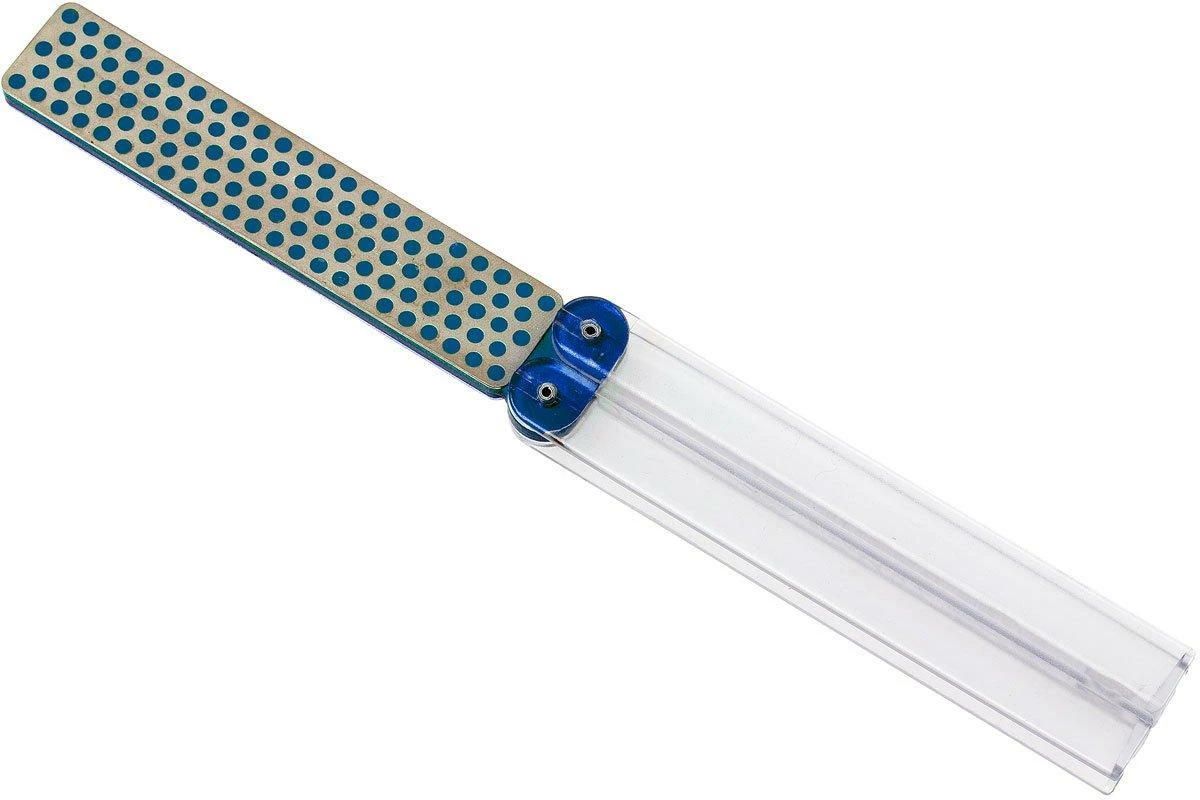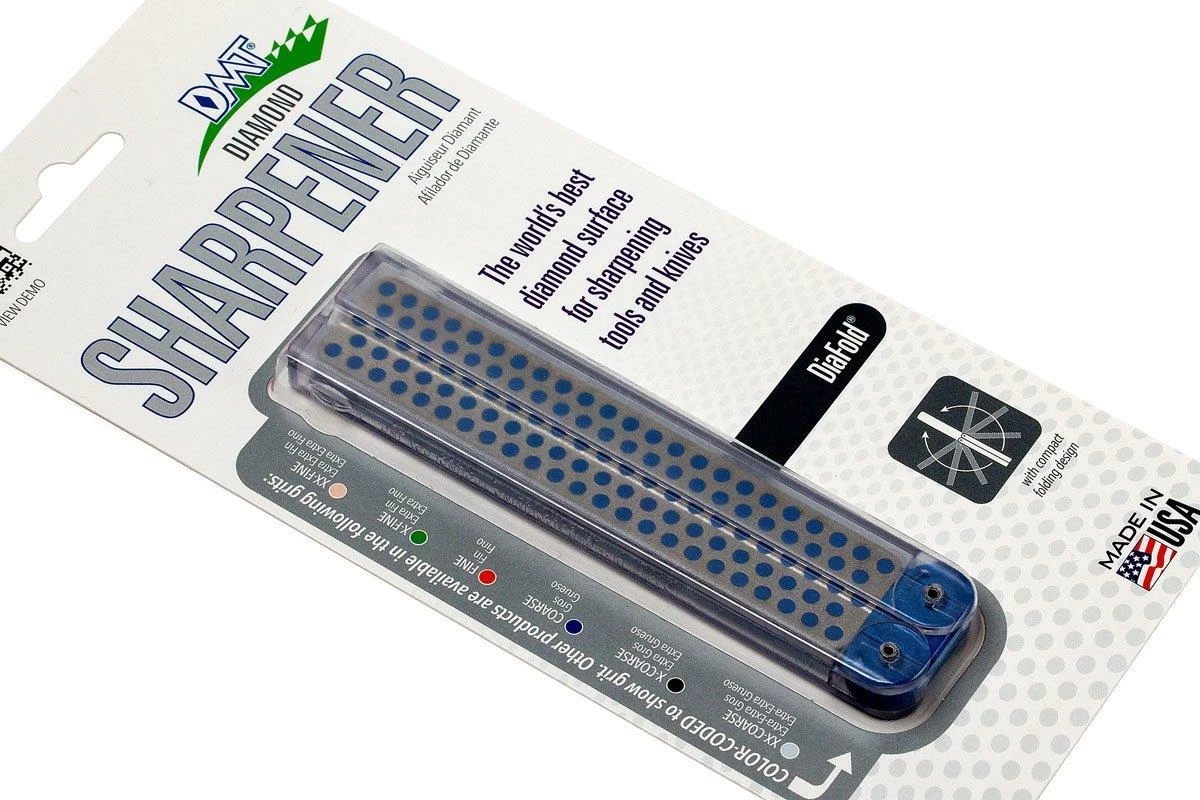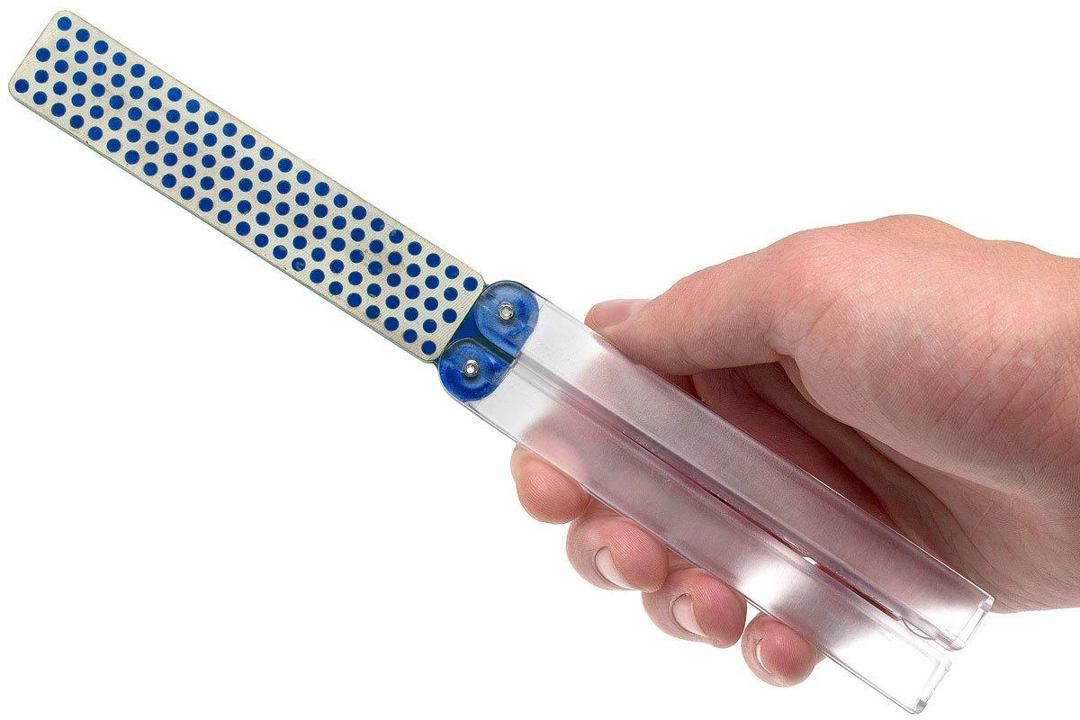 Une pierre à aiguiser Diafold est construite comme un couteau papillon, le manche se replie sur la pierre à aiguiser diamant. La pierre est ainsi parfaitement protégée. La pierre s’utilise d’un seul côté. La couleur du fameux motif à pois caractéristique de DMT indique les différentes tailles de grains.