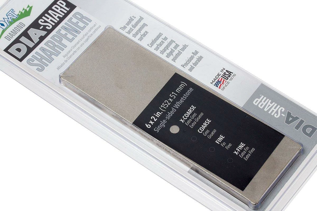 La DMT DiaSharp Bench Stone 6×2 D6X monoface, extra grossière est une pierre à aiguiser compacte. La pierre extra grossière est idéale pour enlever la rouille ou pour aiguiser les outils lourds. Les pierres à aiguiser diamant permettent un aiguisage très rapide, et extrêmement tranchant avec certaines granulométries. L’un des grands avantages des pierres à aiguiser diamant est qu’il n’est pas nécessaire de les aplanir. Sur ce modèle DiaSharp, le diamant abrasif est appliqué sur une plaque d’acier de 6 mm d’épaisseur. Cela garantit une pierre à aiguiser parfaitement plate.