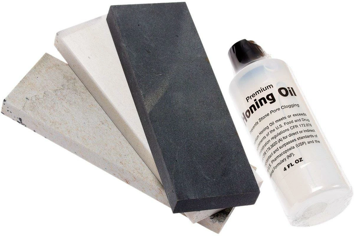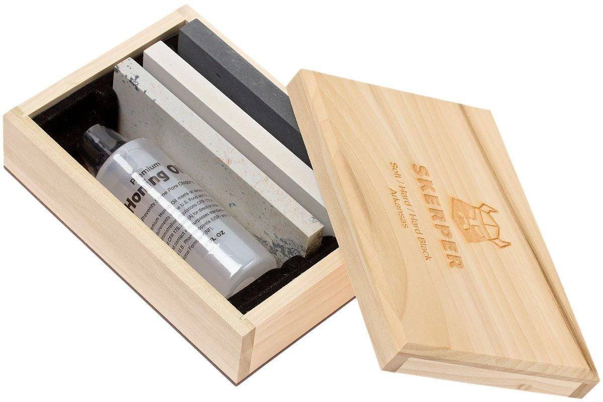 Set d’aiguisage Skerper Arkansas Deluxe avec trois pierres à aiguiser et 118 ml d’huile d’aiguisage présenté dans un coffret de rangement en bois. Le set comprend des pierres à aiguiser Soft, Hard et Hard Black Arkansas. La pierre Soft Arkansas (400-600 grit) est parfaite pour redonner son tranchant à une lame. La pierre Hard Arkansas (800-1000 grit) perfectionne ensuite son tranchant avec une finition polie. LA pierre Hard Black Arkansas (2000-3000 grit) poli finement la lame.