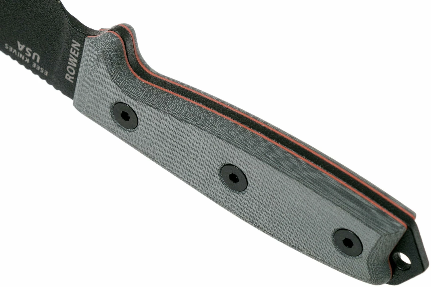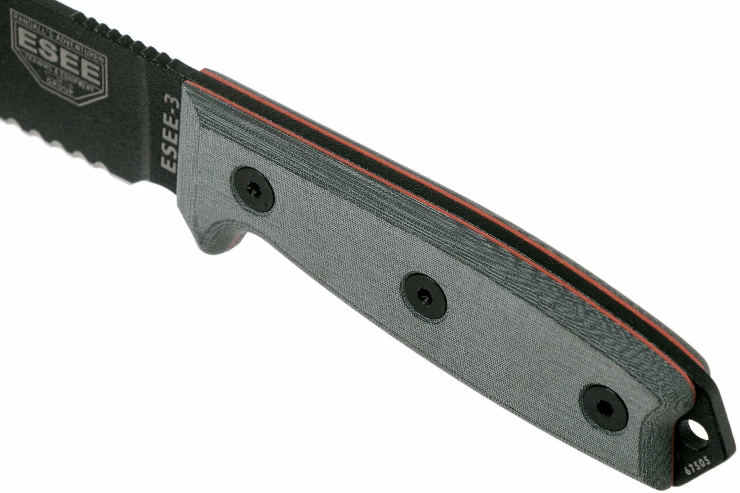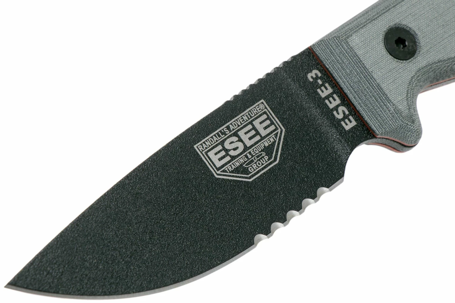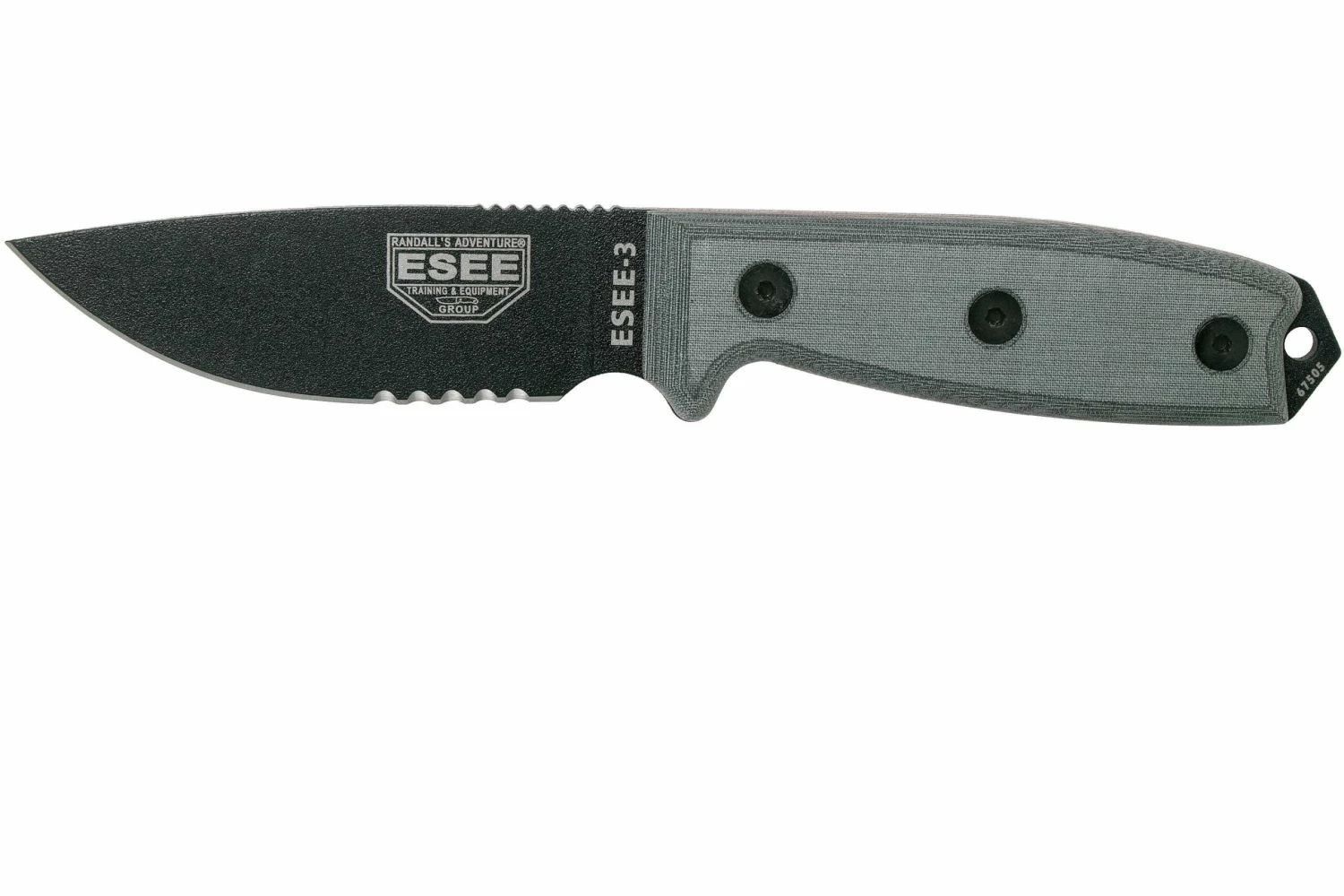 L’ ESEE Model 3 est un couteau de survie solide avec une lame en acier carbone 1095. L’acier carbone n’étant pas résistant à la corrosion, un revêtement poudré est appliqué sur la lame pour une meilleure protection contre la rouille. La grande performance de l’acier garantit un plaisir d’utilisation à vie. La lame full tang est entourée d’un manche en micarta. Ce manche est un peu rugueux au toucher ce qui permet une bonne adhérence et un confort d’utilisation optimal. Le ESEE 3 a une taille relativement modeste afin ne pas être trop ‘intimidant’ pour le monde qui vous entoure. Avec ces dimensions, il peut être utilisé comme couteau EDC. Il s’agit de la version 3S, la lame est partiellement dentelée.