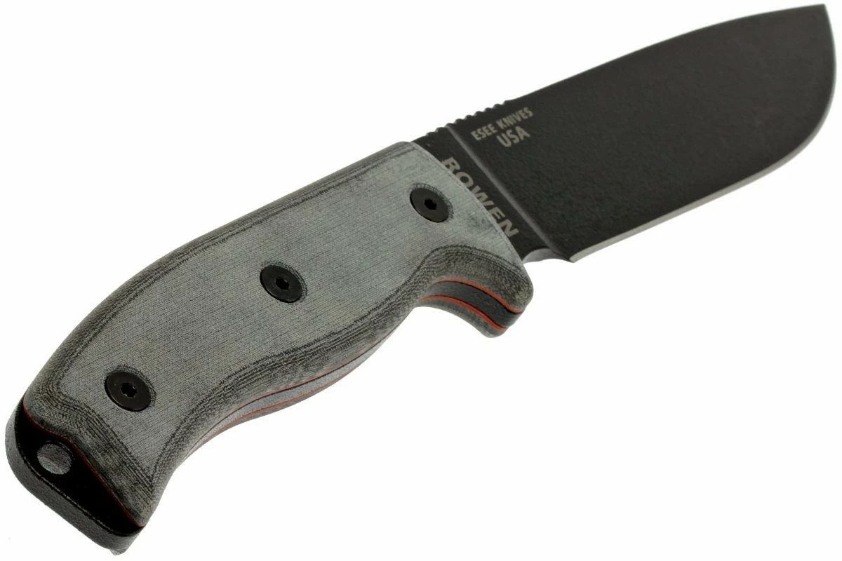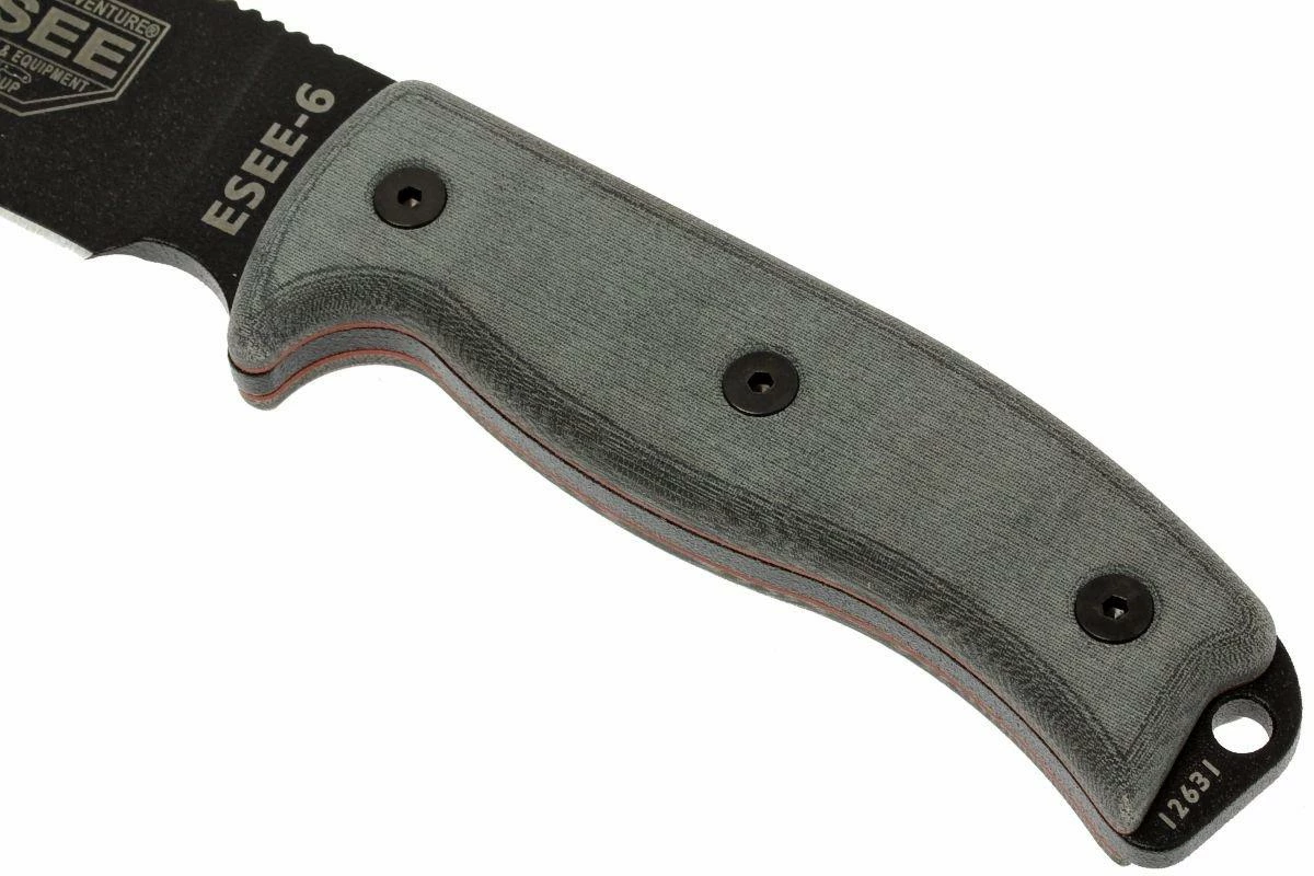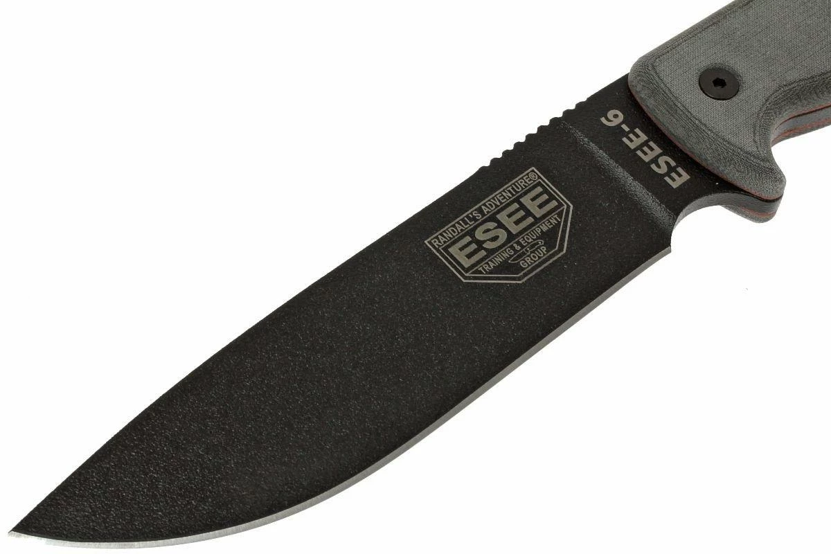 L’ESEE Model 6 est un couteau de survie solide avec une lame en acier carbone 1095. L’acier carbone n’étant pas résistant à la corrosion, un revêtement poudré est appliqué sur la lame pour une meilleure protection contre la rouille. La grande performance de l’acier garantit un plaisir d’utilisation à vie. La lame full tang est entourée d’un manche en micarta. Ce manche est un peu rugueux au toucher ce qui permet une bonne adhérence et un confort d’utilisation optimal. L’ESEE 6 est un couteau large et robuste pouvant résister à une utilisation très rude. Avec un poids de 335 grammes, il est relativement lourd. Un poids lourd au tranchant rasoir.