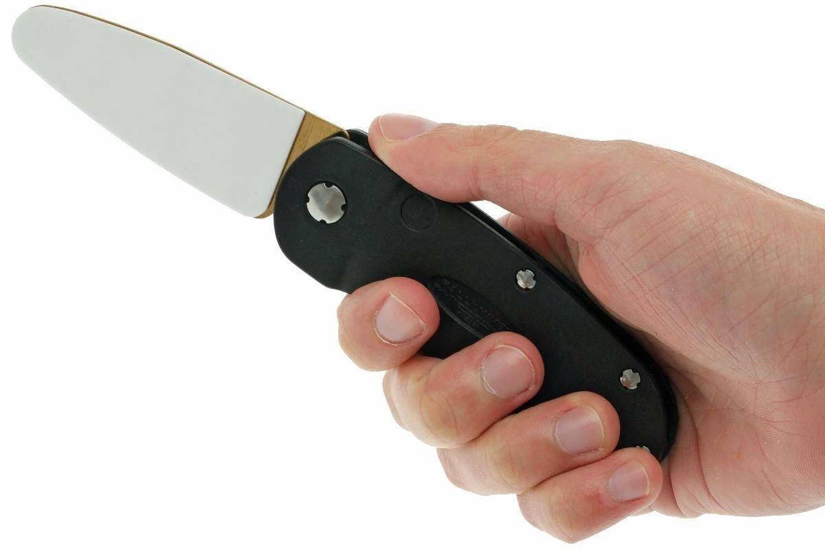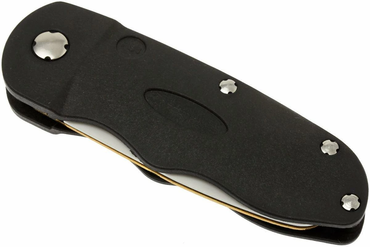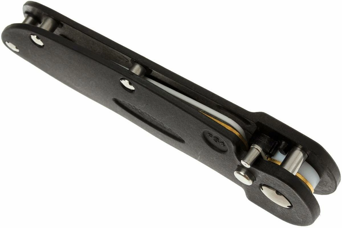 L’outil Flipstone est une pierre à aiguiser repliable qui peut être utilisé des 2 côtés. Les dimensions sont comparables à celles d’un couteau de poche. La FS4 est un petit peu plus grande que le FS3. On peut donc toujours l’avoir avec soi. La face jaune est une pierre en diamant avec une granulométrie de 25 micron. Elle sert à rétablir le tranchant d’une lame. L’autre face en céramique donne un tranchant maximal. Les deux pierres sont collées l’une à l’autre et donc toujours solidaires..