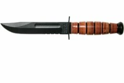 Le KA-BAR Short USMC est une petite version du légendaire KA-BAR 1217. C’est en 1942 que ce couteau a été désigné comme couteau de combat à lame fixe pour les soldats de l’U.S. Marine Corps. Depuis lors, ce couteau fait partie de l’équipement de nombreux soldats. Ce couteau est assez grand et semble très résistant. Le manche est doté d’une garde pour prévenir la main de glisser sur la lame. La lame est en acier carbone 1095. Ce type d’acier n’est pas résistant à la corrosion. La lame est donc recouverte d’un revêtement noir pour faciliter l’entretien. Le manche est conçu en disques de cuir empilés. Confortable même par temps glacial.