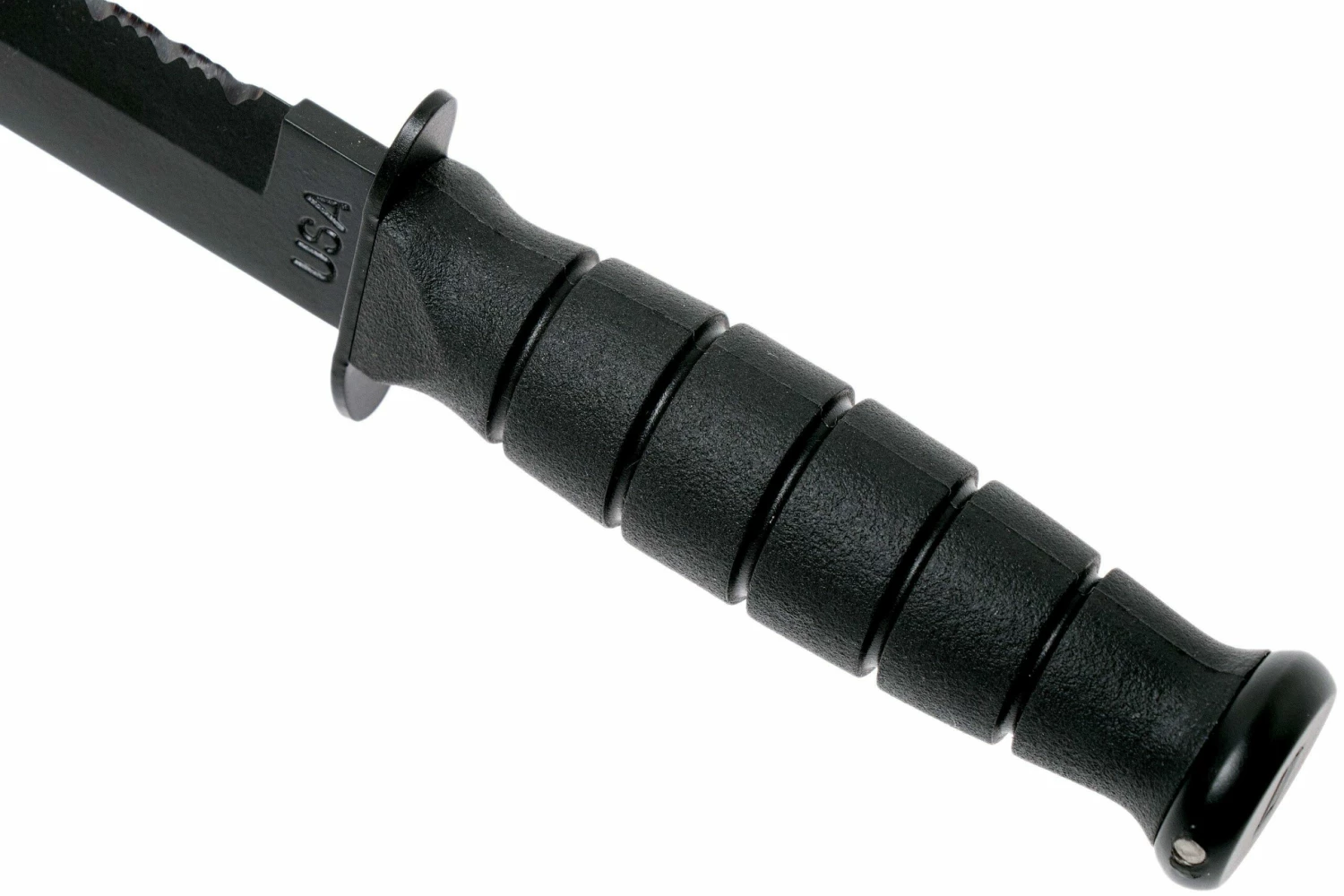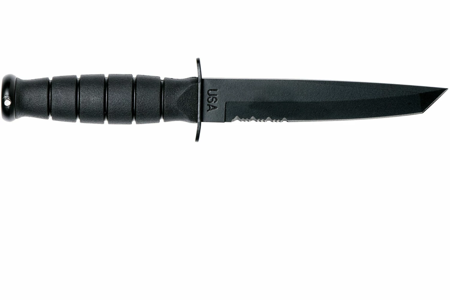 Le KA-BAR Short Tanto est le petit frère d’influence asiatique du célèbre KA-BAR USMC. Le couteau a les mêmes caractéristiques, mais avec une lame dentelée. Le pouvoir perçant de la forme tanto distingue ce couteau de la concurrence. Le manche est équipée de pièces de protection afin que vous ne risquiez pas de vous approcher de la coupe tranchante lors d’une utilisation intensive. La lame est en acier carbone 1095. Cet acier n’est pas inoxydable mais la lame est recouverte d’un revêtement noir, ce qui facilite grandement l’entretien. Vous transportez le KA-BAR 1255 avec vous dans l’étui en cuir fourni.