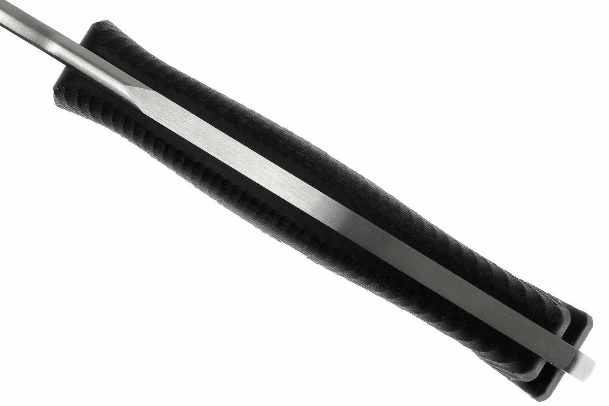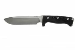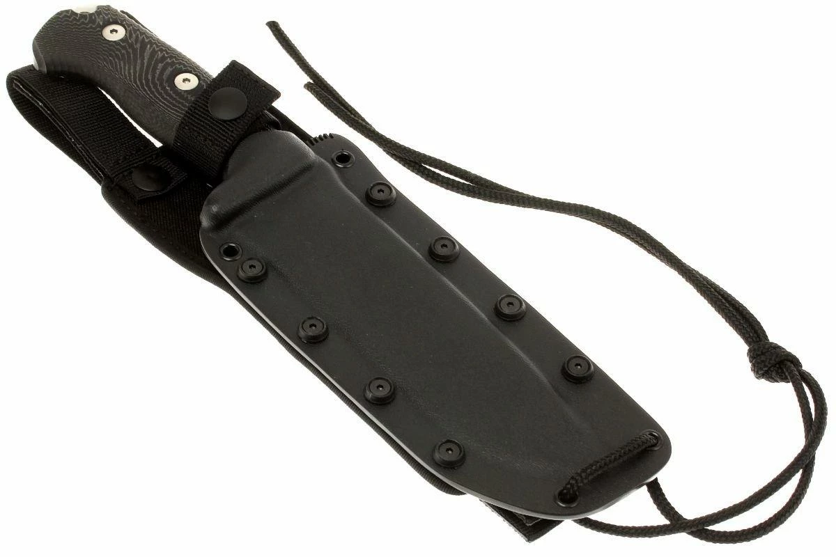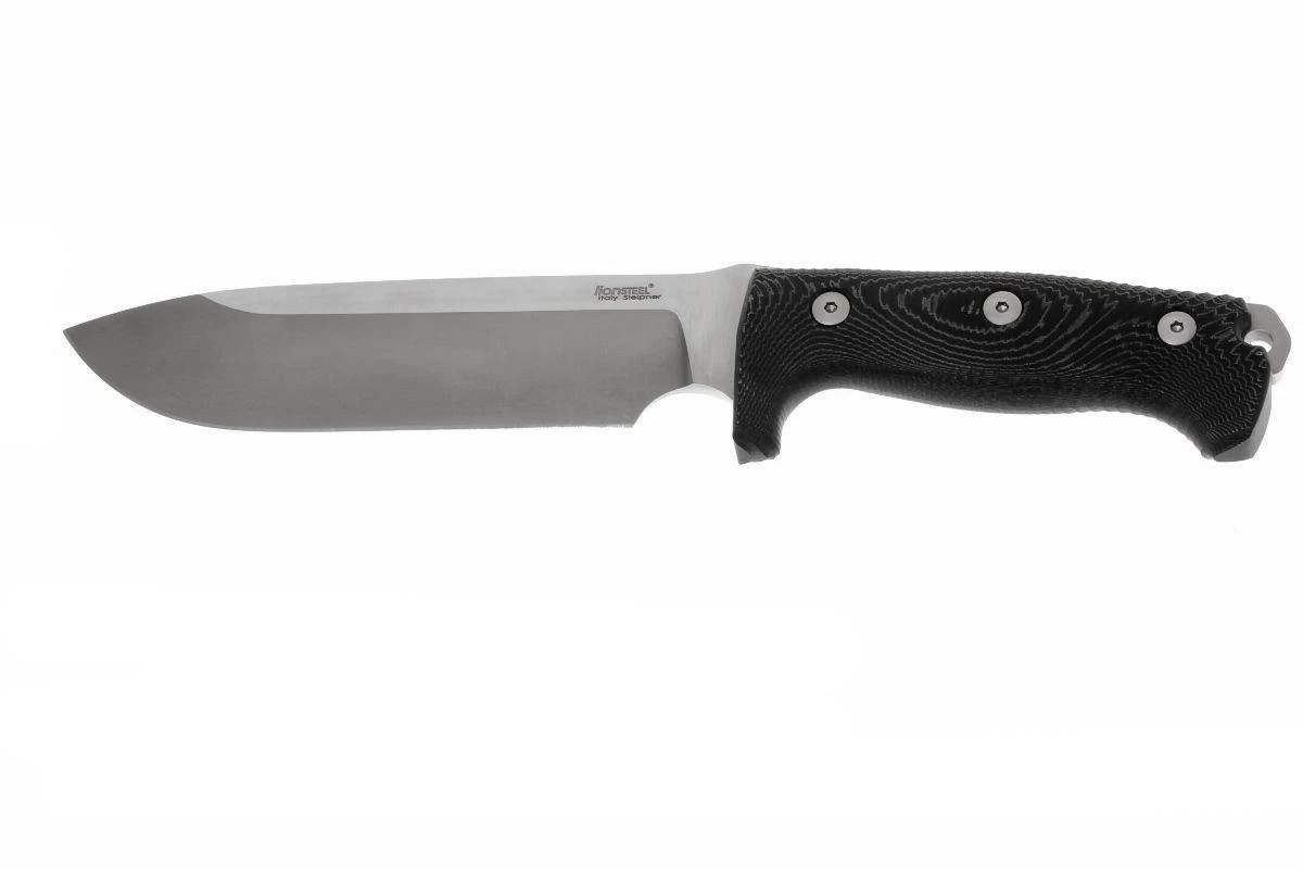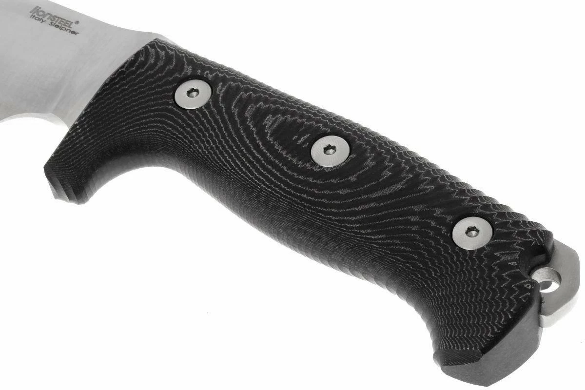 Le M7 est un couteau à lame fixe polyvalent destiné à une utilisation Outdoor. Ce couteau est basé sur une édition limitée conçu en collaboration avec le coutellier Michele ‘’Molletta’’ Pensato : le Carthago. Après quelques modifications, le M7 est né : un couteau avec une lame full tang et un manche en micarta. Le manche est largement assez grand pour l’intégralité de votre main. Un jimping a été ajouté pour une meilleure adhérence et un meilleure contrôle de la lame. La forme spéciale donnée au revêtement en micarta n’augmente pas seulement l’adhérence du manche mais ce design particulier permet aussi de reconnaitre immédiatement un couteau LionSteel. Ce couteau est unique de par son manche, usinée à partir d’une seule pièce de micarta. Dans un cas classique, deux pièces de micarte seraient fixées au manche par des rivets alors que dans le cas du M7, c’est la lame qui vient s’encastrer dans la pièce en micarta. Ce grand couteau est relativement lourd. La lame en acier Sleipner, mesure, 5,5 mm d’épaisseur. Combiné avec une dureté de 60-61 HRC, ce couteau très masculien est parfait à utiliser dans des condition extrêmes.