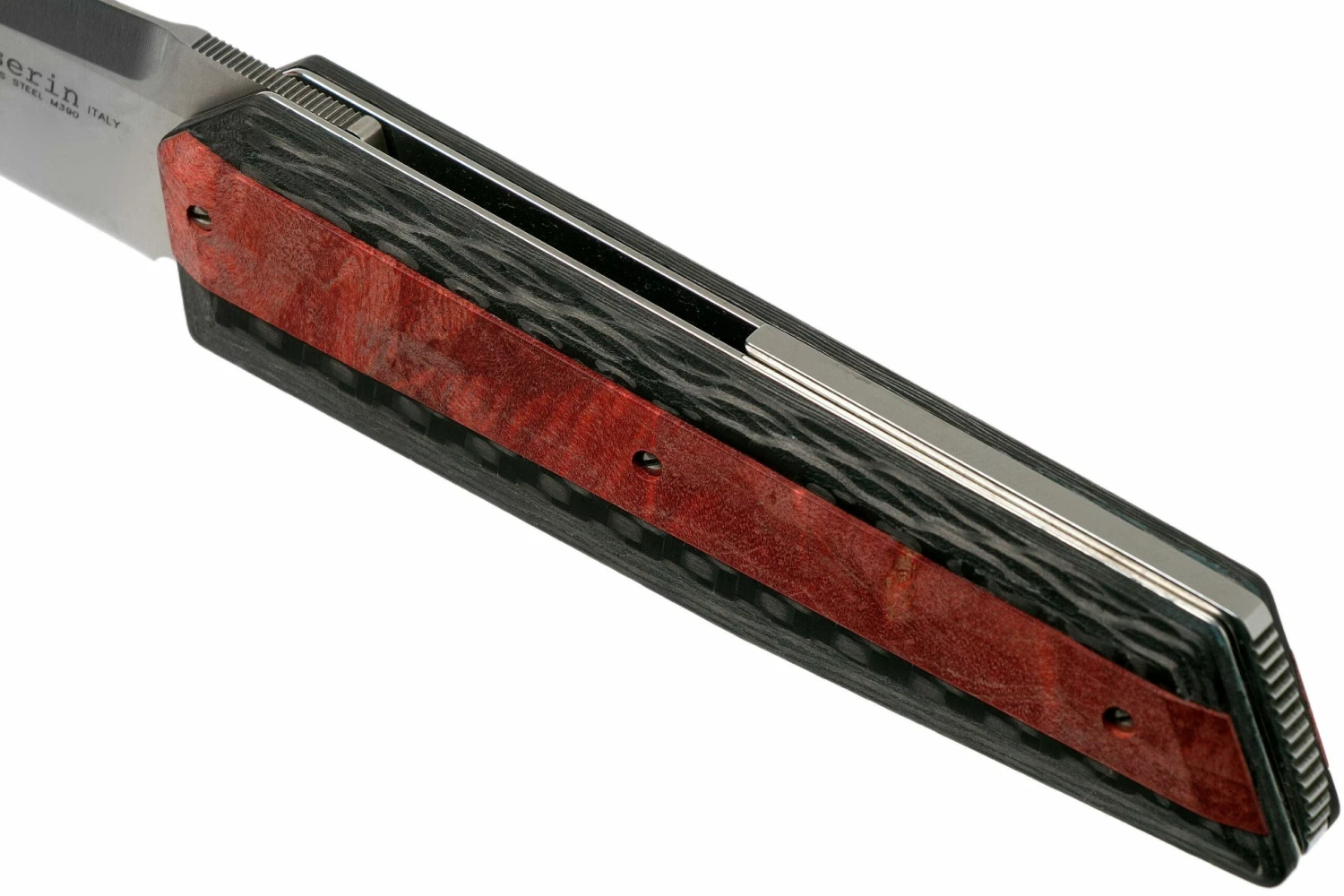 Le Maserin AM4 est un couteau de gentleman particulier, conçu par Attilio Morotti. Le manche attire immédiatement le regard. Autant par le choix des matériaux que pour son format. Il s’agit de fibre de carbone incrustée d’érable coloré. Une combinaison très particulière. Son épaisseur apporte une prise en main parfaite, même avec de grandes mains.