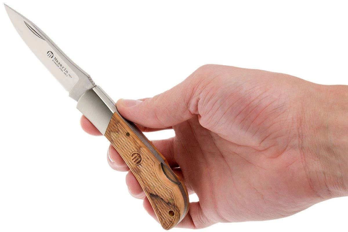Le Maserin Caccia est un couteau de poche classique, conçu pour la chasse. Ce n’est pas sans raison que le nom Caccia signifie littéralement chasse en italien. Le manche classique arbore une mitre en acier et de belles pièces de manche en bois d’olivier. On y trouve un motif en arête de poisson gravé au laser. Très beau et permettant encore plus d’adhérence, super pratique !
