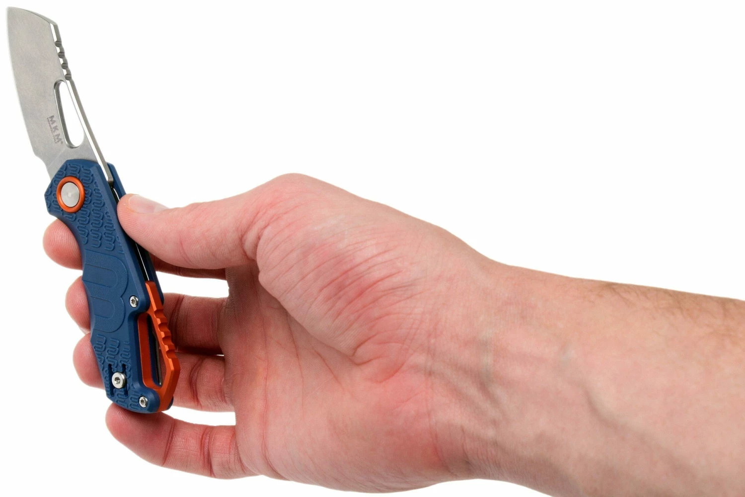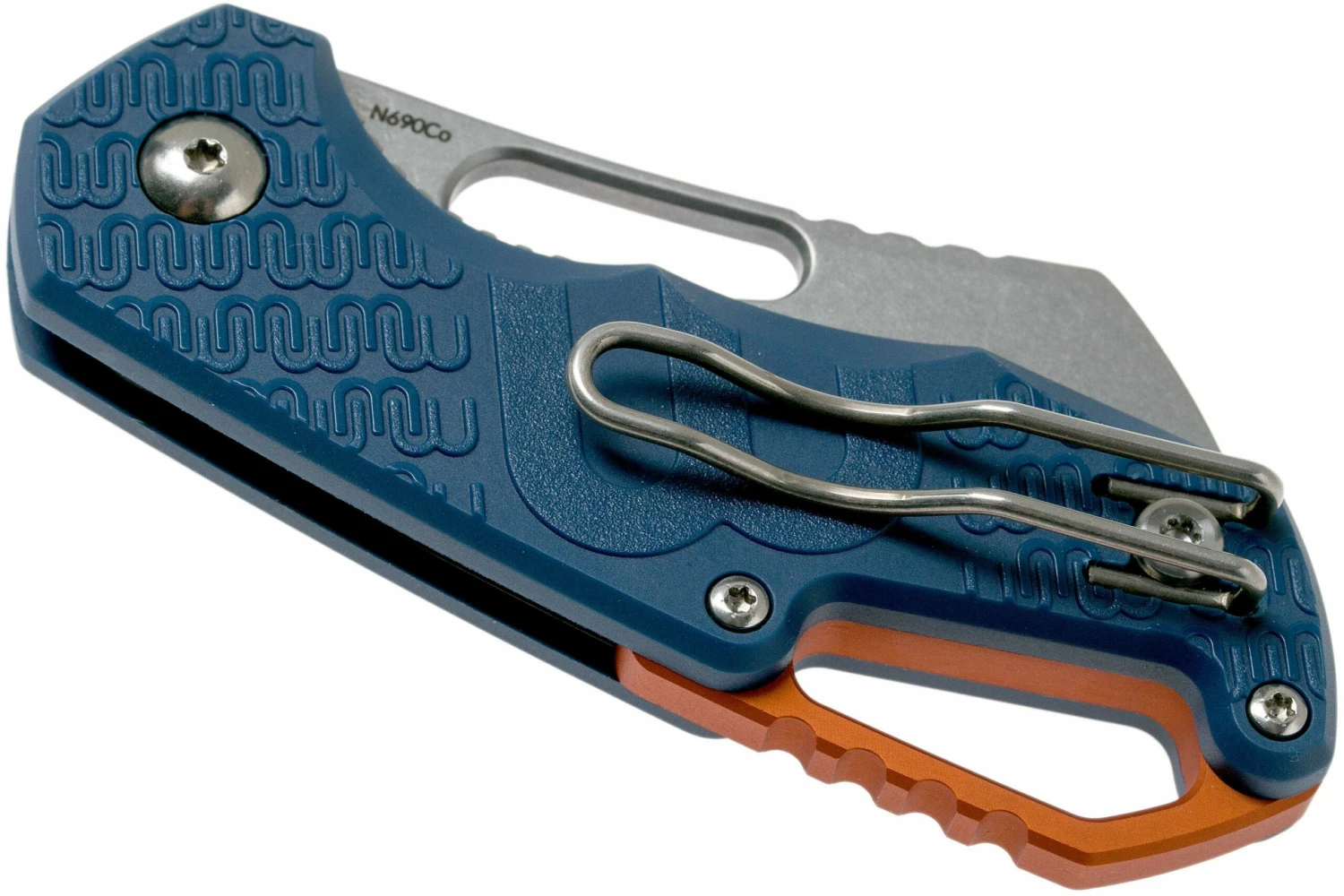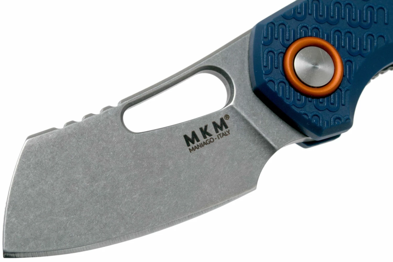 Le MKM Isonzo FX03-2PBL Cleaver Blue FRN est un solide couteau de poche conçu par Jesper Voxnaes et fabriqué par Fox Knives. Le style de Voxnaes est clairement reconnaissable. Des lignes fluides, la forme du trou pour le pouce et le backspacer avec trou pour lanyard. Ce trou pour lanyard est extra large de sorte à pouvoir y attacher un mousqueton. En effet, en plus d’être conçu pour une utilisation EDC, ce couteau est destiné aux amateurs d’activités outdoor et les alpinistes qui aiment attacher leur équipement à portée de main. Grâce à sa petite taille, le Isonzo est parfait comme couteau secondaire ou comme couteau passe partout pour ne pas trop attirer l’attention.