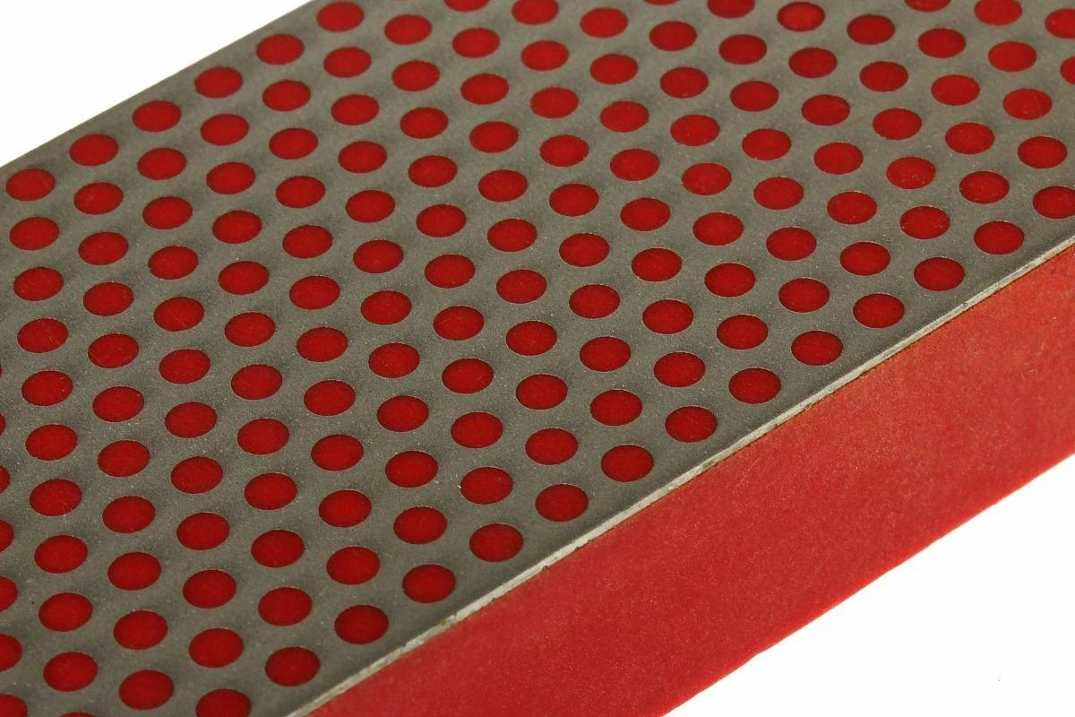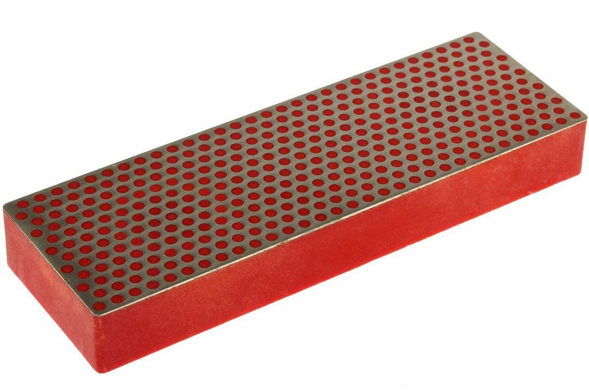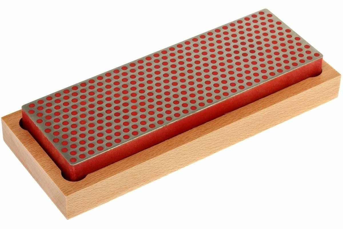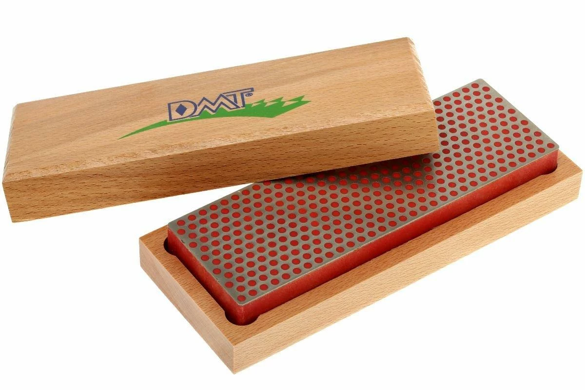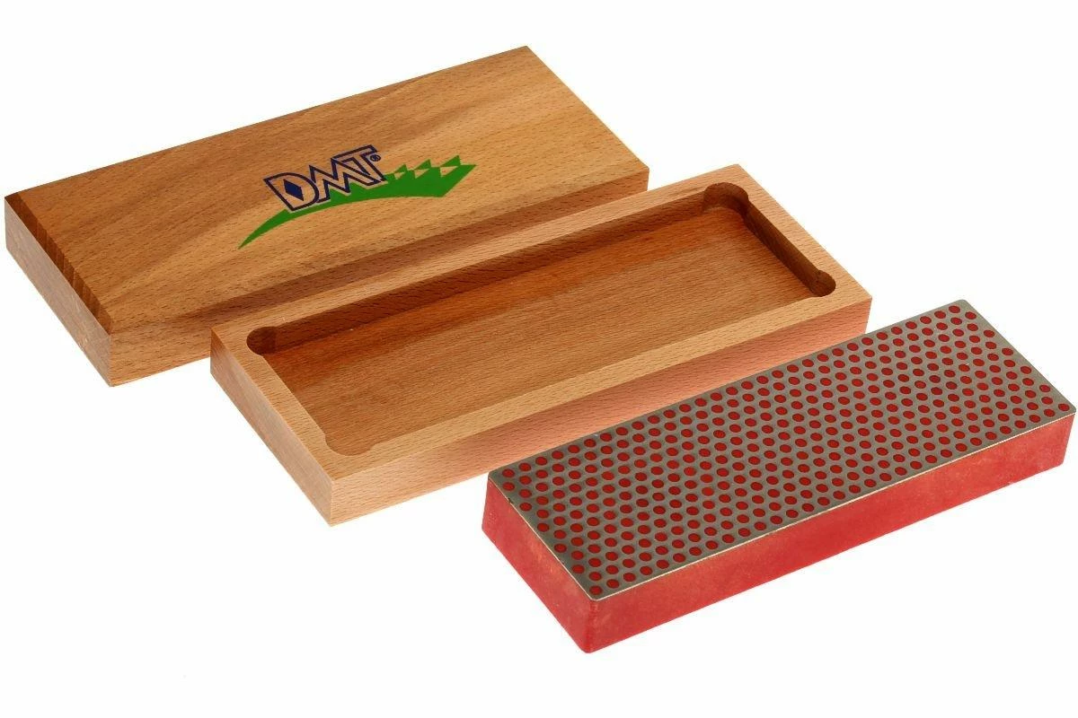 Pierre à aiguiser à la surface d’aiguisage diamantée pourvue du motif à pois caractéristique de DMT. Cette pierre a un grain fin. Cette pierre à aiguiser est livrée dans un boîtier en bois pourvu de pieds antidérapants.