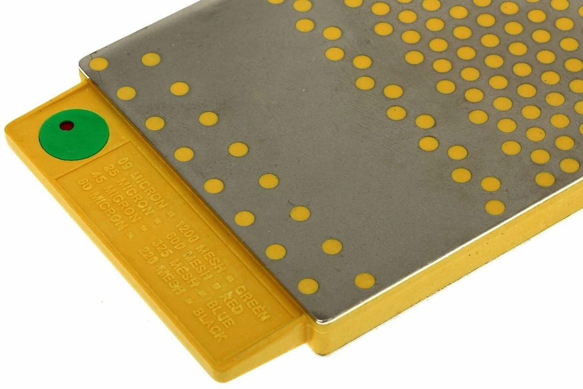 La DMT Harcoat Duosharp Plus WM8EF est une pierre à aiguiser diamant grand format biphasée parfaite pour aiguiser les grands couteaux. Une partie de la surface d’aiguisage est pourvue du fameux motif à pois caractéristique de DMT, une partie est occultée. Cela permet d’aiguiser des petits ciseaux à bois ou autres outils de petite taille sans qu’ils se coincent dans les alvéoles. Un côté de la pierre arbore une granulométrie fine, et l’autre, une granulométrie extra fine. On reconnaît la granulométrie aux bandes rouge et verte.