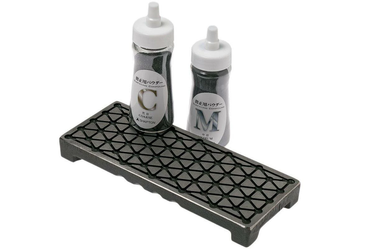 Cet ensemble Shapton Naoru Cast Iron Lapping System est conçu pour aplanir et nettoyer vos pierres à aiguiser. Il est prévu pour Shapton mais il peut tout aussi bien être utilisé sur des pierres à aiguiser d’autres marques. Cet ensemble se compose d’une pierre à redresser en fonte et de deux flacons de poudre à redresser, lapping powder en carbure de silicium : grossier et moyen.