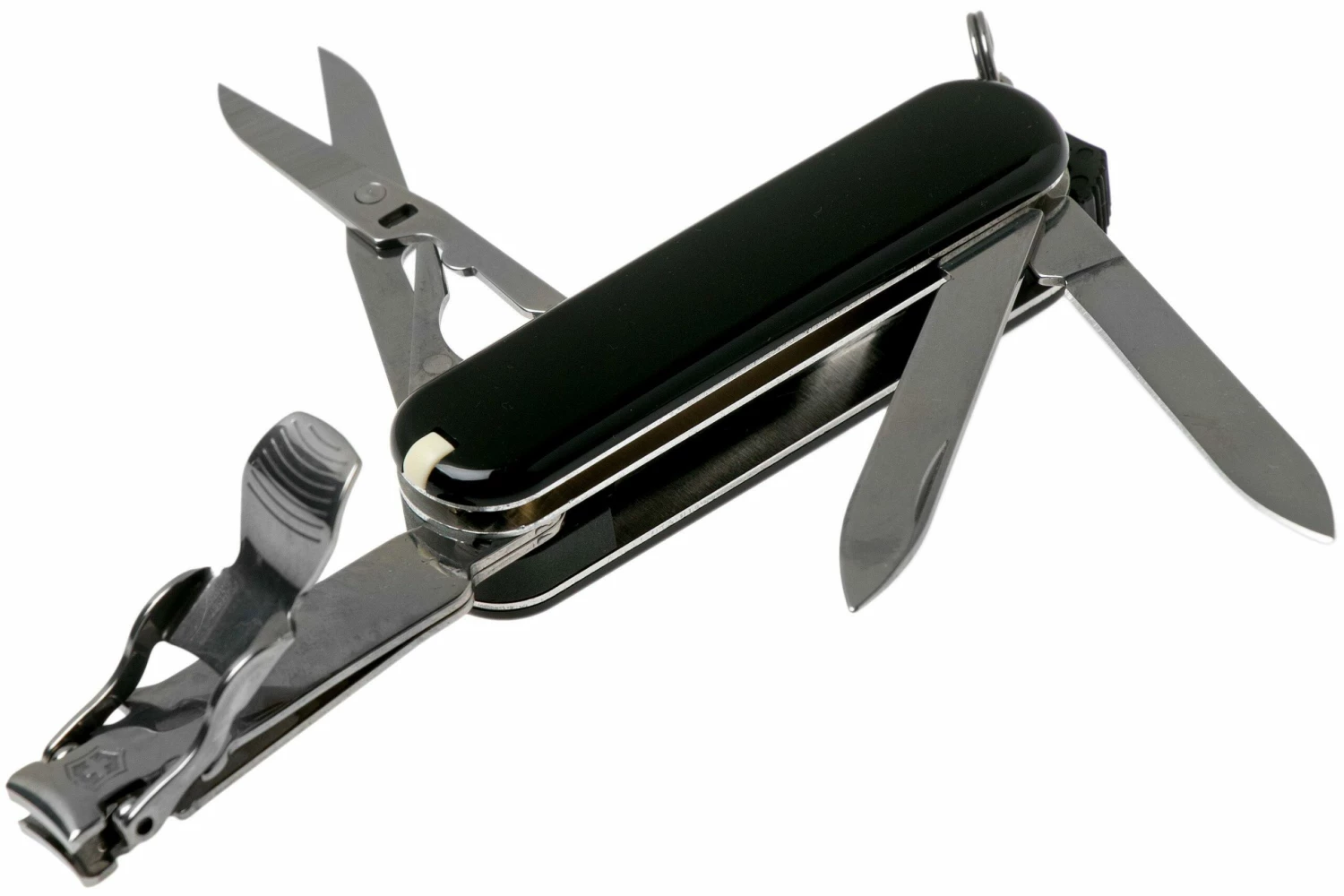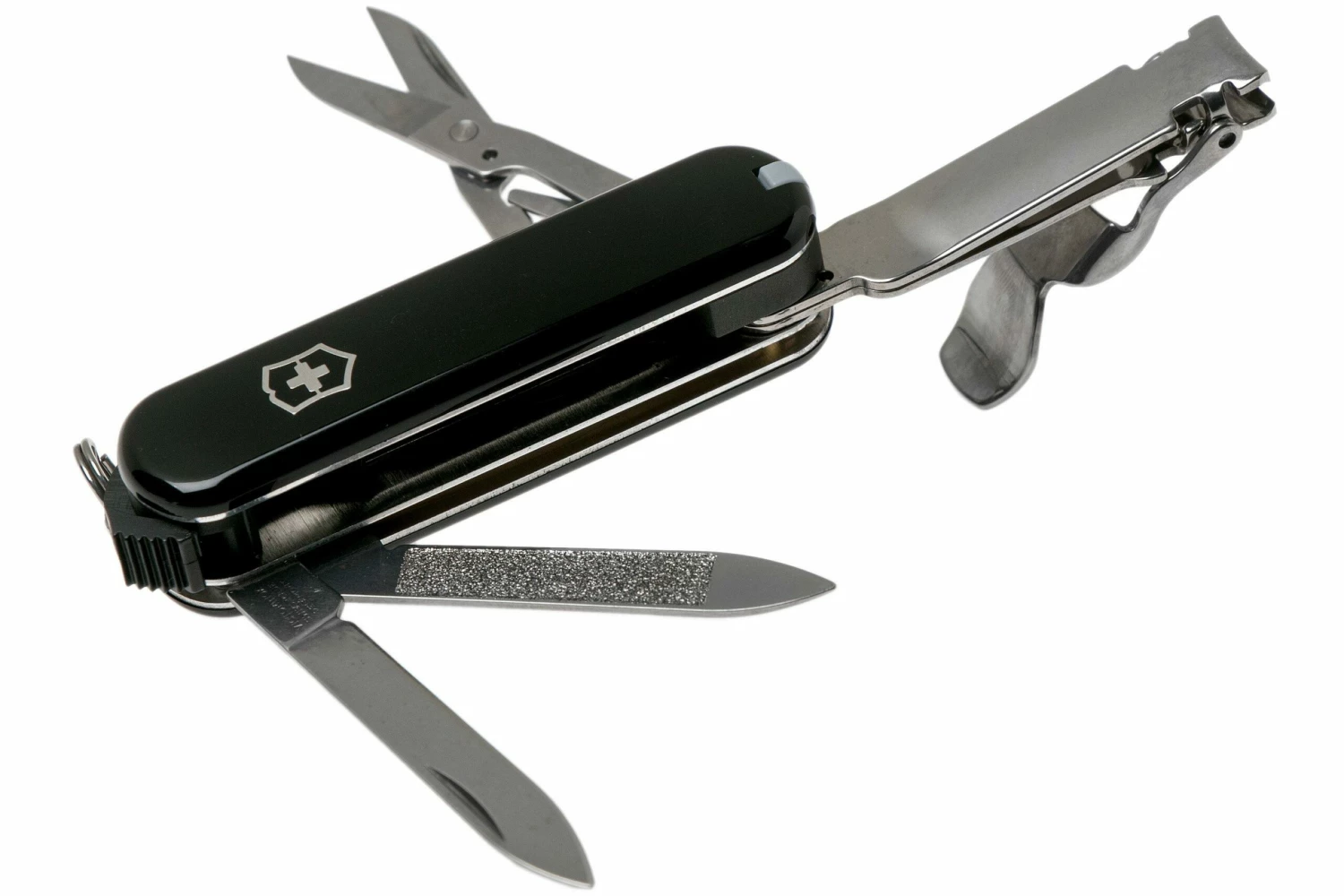 Le Victorinox Nail Clip 580 ressemble à première vue à un couteau suisse typique. Cependant il s’agit plutôt d’un ensemble manucure multifonctionnel dans un format compact. Cette version du Victorinox Nail Clip est équipée d’un coupe ongles, une lime à ongle, un cure ongles et un ciseau. De quoi toujours prendre soin de vos mains où que vous soyez. Le coupe ongles s’ouvre facilement grâce au mécanisme quick release. De plus, ce couteau suisse est équipé d’un anneau pour porte-clés. Les outils sont en acier inoxydable avec une garantie à vie. Les outils sont rangés et protégés dans les coques robustes. Ces coques portent le célèbre logo Victorinox : bouclier avec une croix.
