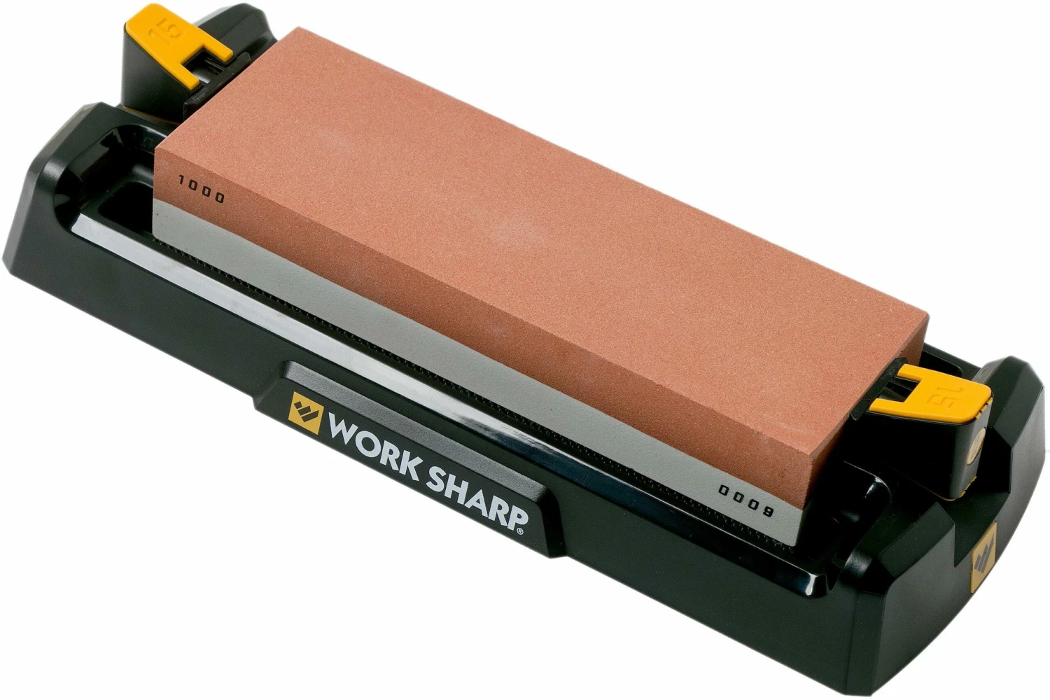 La pierre à aiguiser combinée Work Sharp Whetstone Knife Sharpener est une pierre double face comprenant un bac à eau bien pratique et deux guides d’angle d’aiguisage de 15 et 17 degrés. On trempe la pierre dans l’eau avant de l’utiliser, Il est important de garder la pierre bien humide également pendant l’utilisation, afin de limiter l’usure et d’améliorer le résultat. Le bac à eau facilite l’humidification de la pierre pendant l’aiguisage et évite de mettre de l’eau partout.